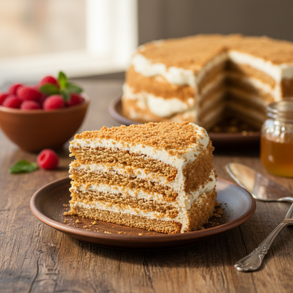 Pidulikumal puhul võid serveerimisel lisada taldrikule värskeid marju, näiteks vaarikaid või punaseid sõstraid. Nende hapukus loob suurepärase kontrasti mee magususega. Samuti sobib kõrvale väike oksake münti värvi lisamiseks. Kui soovid kooki veelgi erilisemaks muuta, võid pealmise purukihi segada röstitud pähklipuruga – see annab tekstuurile meeldiva krõmpsu elemendi, mis täiendab pehmeid kihte ideaalselt. Oluline on meeles pidada, et meekoogi ilu peitub tema lihtsuses ja autentses maitses, seega pole vaja teda üle koormata liigsete glasuuride või kaunistustega.