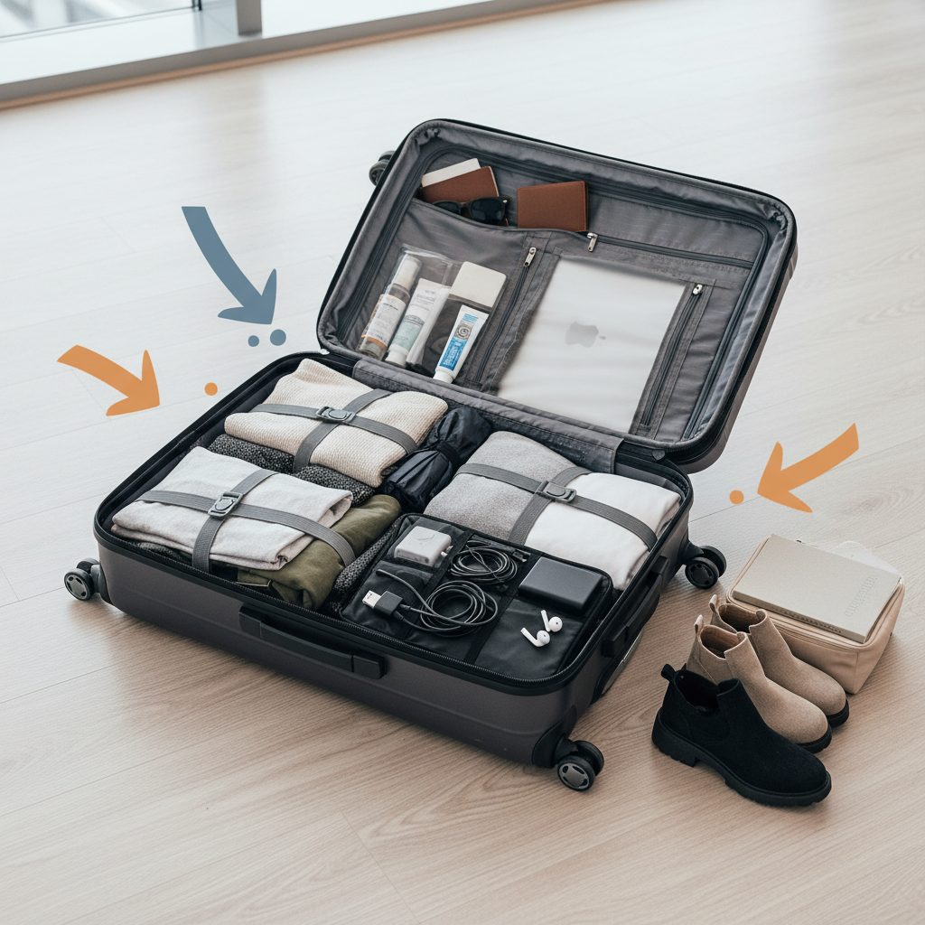 - Kasutage väikseid kotikesi: eralda elektroonika, hügieenitarbed ja riided eraldi kottidesse, et kiiremini vajalik leida.
